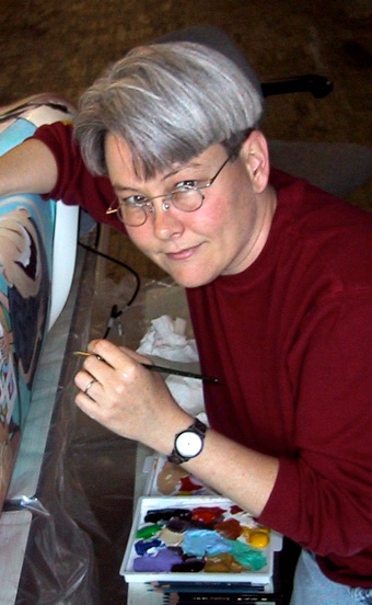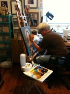 LEFT: Hopkins working on “Seven Sorrows,” a painting included in the 2010 exhibition, “Soothing & Seething: The Madonna Between Hope and Havoc, http://campus.udayton.edu/mary/gallery/MBHopkins/Hopkins.html. This painting has been donated to the 2011 Dayton Visual Arts Center annual auction, www.daytonvisualarts.org.
